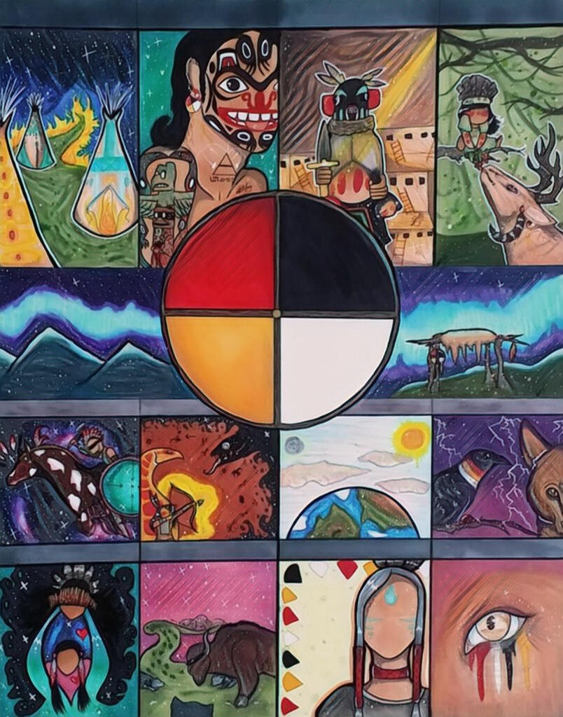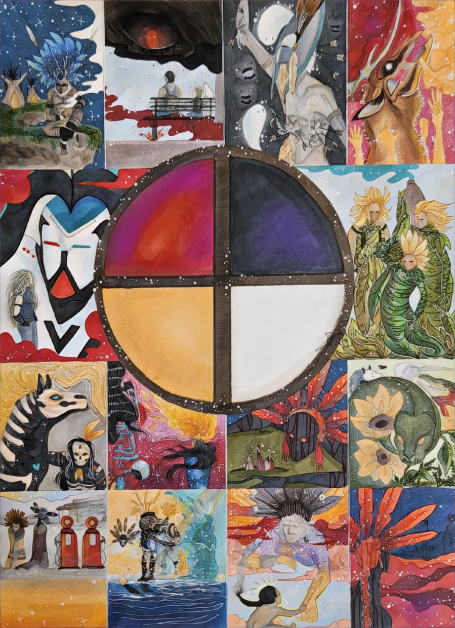 This piece for me, Is a very personal piece because it surrounds around teachings and lessons I've learned in my personal experience and it's a lot to fit in a single drawing but when I think about it; That's a lot to fit into a single life...But that's the Beauty Way and why we live it.My artwork is primarily intertwined with my heritage and my dreams, Both guide me equally as an artist and just overall everyday life. It sounds basic but sometimes the most intricate things have the least intricate answers, Is there ever a correct answer to living in two worlds? Maybe one day I'll learn but for now I coexist in this split while the world's around me change.Every panel drawn is different as this was a "Redraw" (more of an inspiration or reference) from my older piece "Native Ways Forgotten" which was originally a symbolic drawing about us uniting as a people to maintain our voices, Teachings & Languages. That orignal piece was highly influenced by the Lakota Way Calender hence why it contains twelve panels resembling twelve months or Twelve experiences/Lessons.For me, Compressing so much on small paper is apart of its symbolism to me and how living the Red Road while also tackling working a full time food service job, Artist and just overall being in everyday life. It's hard, I don't get to go to powwows as much as I used to when I was little, More weight on your shoulders as you try to balance living in everyday society and maintaining your teachings as it is a way of life and being a young adult trying to survive there is things I feel like collide but it also makes me sit back and re-imagine what it was like for my ancestors as they watched their lands grow smaller and their homes and people shrink the more times changed. You can't necessarily compare TODAY to THEN but it also reminds me the resilience and all the other artists like me who are most likely going through the same thing, Having to wear masks until you can finally go home and do medicine and recharge until the next week of struggle. But alas, We persist and we carry our traditions through. And it gives me hope for the future generations and the strength we have as a nation, To fight for ourselves and for each other.It's incredible when you get to sit back for five minutes and understand we are living in two worlds, But despite that we are walking in the same footsteps as our grandparents did, As their grandparents did and so on. I'm here because of their struggles and them facing a even more difficult battle than I am and it keeps be fueled to continue doing what I'm doing.As stated before, My work is also heavily influenced by my dreams and the beings I see when I sleep. To me they offer another form of guidance and even warnings from time to time that I'm grateful I listened when I look back on those times, Despite good and bad in the end it's an experience and I'm guided by things much larger than me and as an artist I feel obligated to do my part to fight for my people and to draw the beings that are there for me and remind me who I am when everything around me crashes.I am thankful for this medicine, And I am thankful for this land. My gratitude knows no bounds when it comes to those around me whether they are in this world, Or the sprit world as I have many in both. And when it's time for our crossworlds to merge again I believe it will look a little like this.There is never enough to say, But I can say confidently it is a beautiful day to be here.