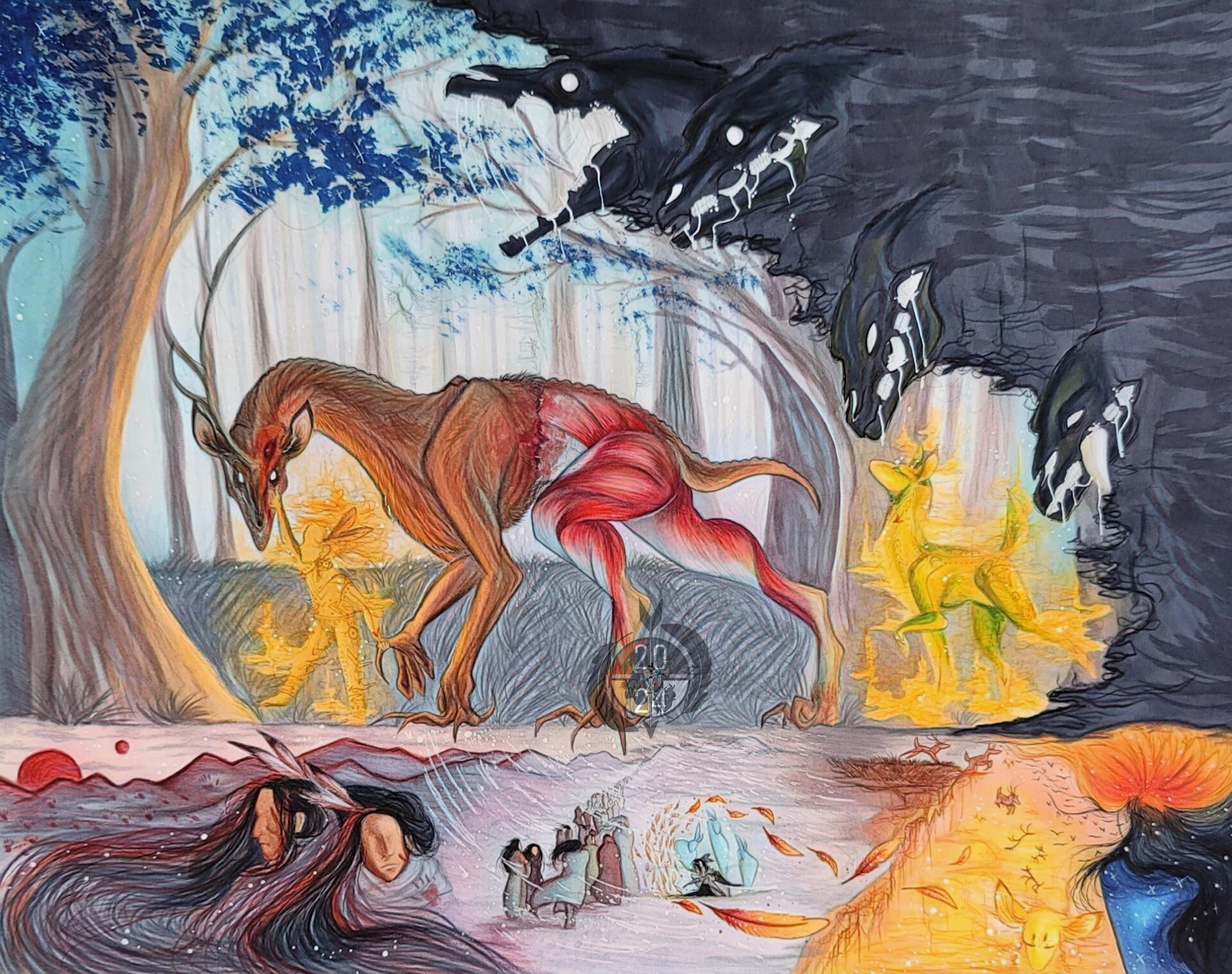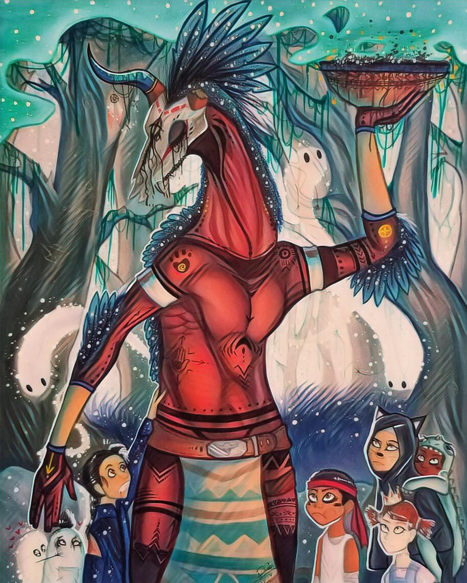 We as indigenous people believe you are not punished for what you do not know, But this illustration was also an interpretation for other's who punish for what they do not understand. I believe Deer Fire was a great example of this due to people's assumptions on what he is because of the way he looks, And if you think he's the spirit that starts with a "W" and you didn't know this; But he is not. Deer fire looks the way he does because he did not cross over fully, He is between both worlds as he won't leave is body due to grieving for his family. A raging fire and sorrow carries within him, He does not decay and he does not eat. He is a cycle of loss, Justice and rebirth.Another example in this piece is the mistreatment on Indigenous people, Especially by religious churches and the people in them. To me, Opinions do not matter to me about this statements because it is a FACT my ancestors were brutalized, Tortured, murdered and then their children put into boarding schools with their hair shaved and their tongue's cut if spoke in their language for religion.They punished our people over fearing what they do not know, And tried creating a controlled country to keep this sickening mindset in the name of God.I am aware people interpret this as against religion and people who are religious but that is far from it, These are facts. This is history, My people's history and we have a right to speak about it. We who walk the Red Road do not allow fear to control us, Or allow spite to get the better of us and do to other's what was done to us and is still being done to this day by our government.
