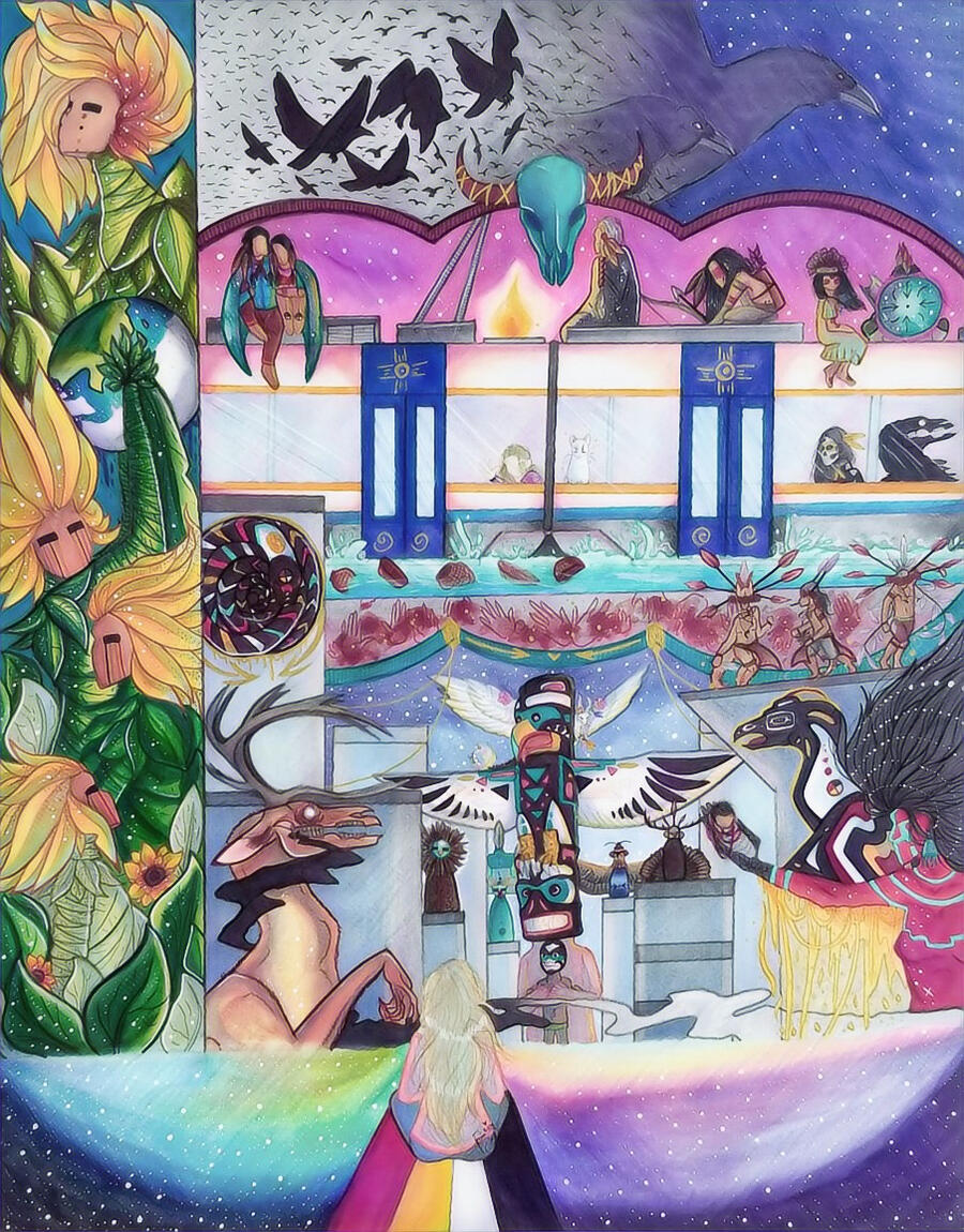 I grew up going to the Sacramento Powwow every year on Broadway and visiting SNAC ( Sacramento Native American Health Center ). And our Local CO-OP. This piece represents my experiences and life in Sacramento and what it means to me, when I was little I'd have to ride the light rail and I used to look out the window and draw, ALOT. The People 'camping' on the train represent the spirits around Sacramento and how I believe they looked out for my mom and I during the really hard times. if you live Downtown, you know at a certain time everyday a Group of Crows and Ravens will fly into a certain area and begin to caw for hours and its Amazing. I always imagined them flying in and out of the spirit world seeing the things I don't see. What I added to this piece is something from every drawing I've done for a gallery or event because each one was such an important part of my life and I couldn't be here without them. The water and baskets represent the Baskets that were sacrificed into the streams in California during the gold rush and to represent how far we've come despite the mistreating's and Genocides we've had to overcome these past generations. This is probably the most personal piece I've drawn and It reminds me how grateful I am for living in Sacramento and for growing up on this Land and for its Rightful People who have taken care of it for Centuries.
