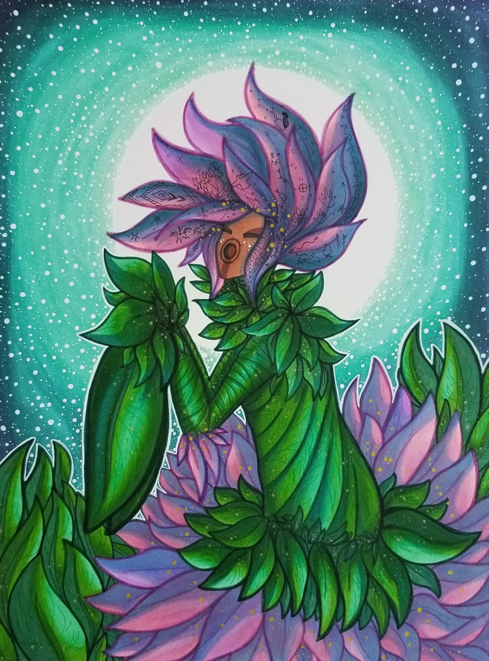As she wondered through the valleys to listened to mother earth sing, her petals flourished around the landscape as they engulfed their roots to steady themselves from the environments rapid changes.Iris, could not see like others could. Her movements were based from feelings, vibrations and guidance. She listened closely to the beings around her, she did not speak like others did. She would almost click or squeak like a bat, that was until she would mimic the music she heard from the ground up.When she'd sing under the moonlight, she'd begin to not see but feel the images around her as she gazed into the distance. The engraved paintings on her petals would emerge into her imagination as she watched them dance into the empty black sky, she could only see in four colors of which were Red,Black,White & Yellow. The colors of her world, the colors of Mother Earth, The Plant People, The Creature Teachers, The Two leggeds and all living creatures.