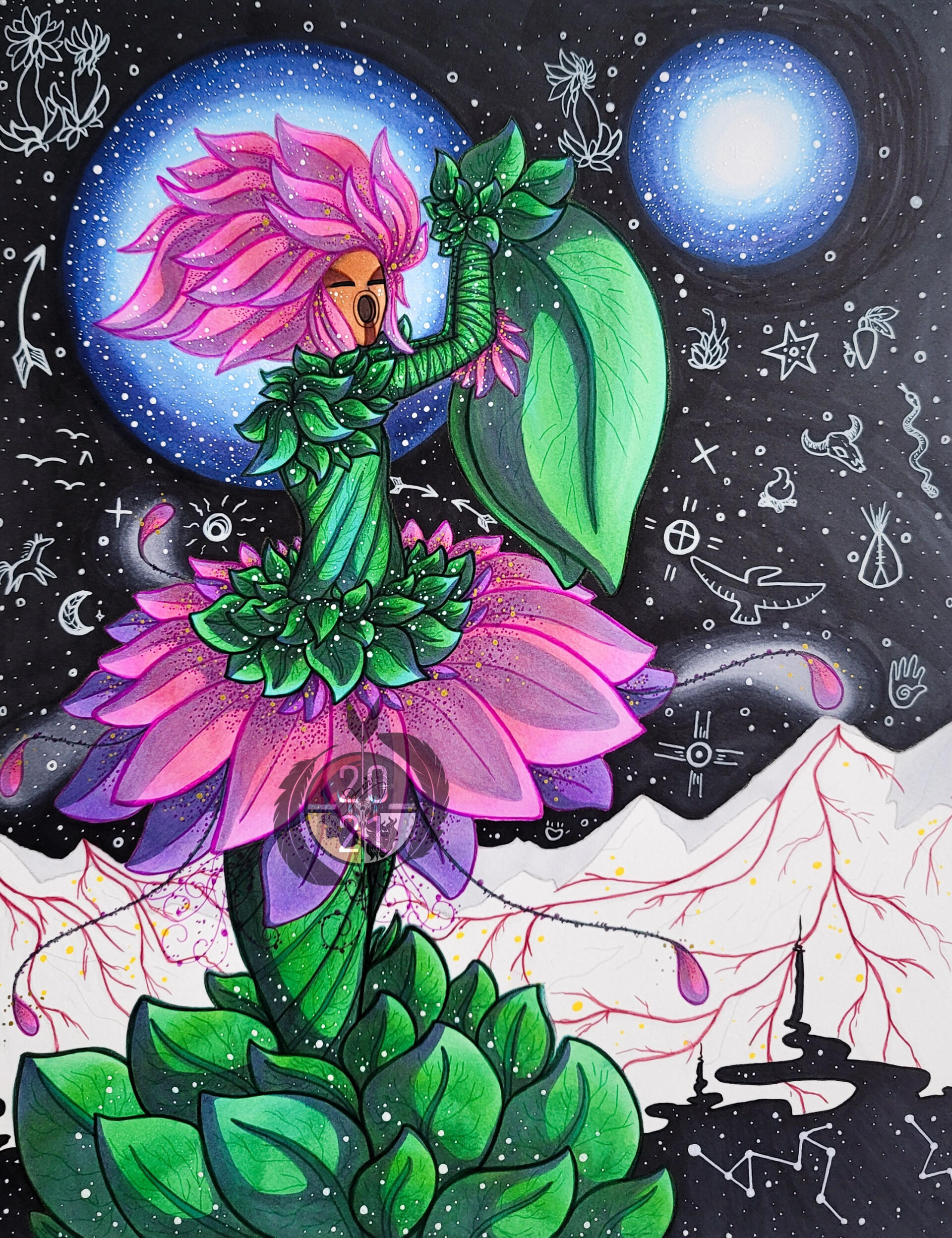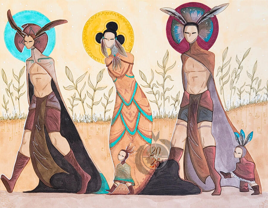 Everything is temporary and change is a constant wheel that turns in four directions.The fire spirits in this drawing look like deer to represent the compassion fire has for the ecosystem and its creatures, because after the burn comes new life and a new start. The Ina Sunflower Kachina represents us as Indigenous People, as cliché as it sounds I like to say we go through our own wildfires in everyday life.