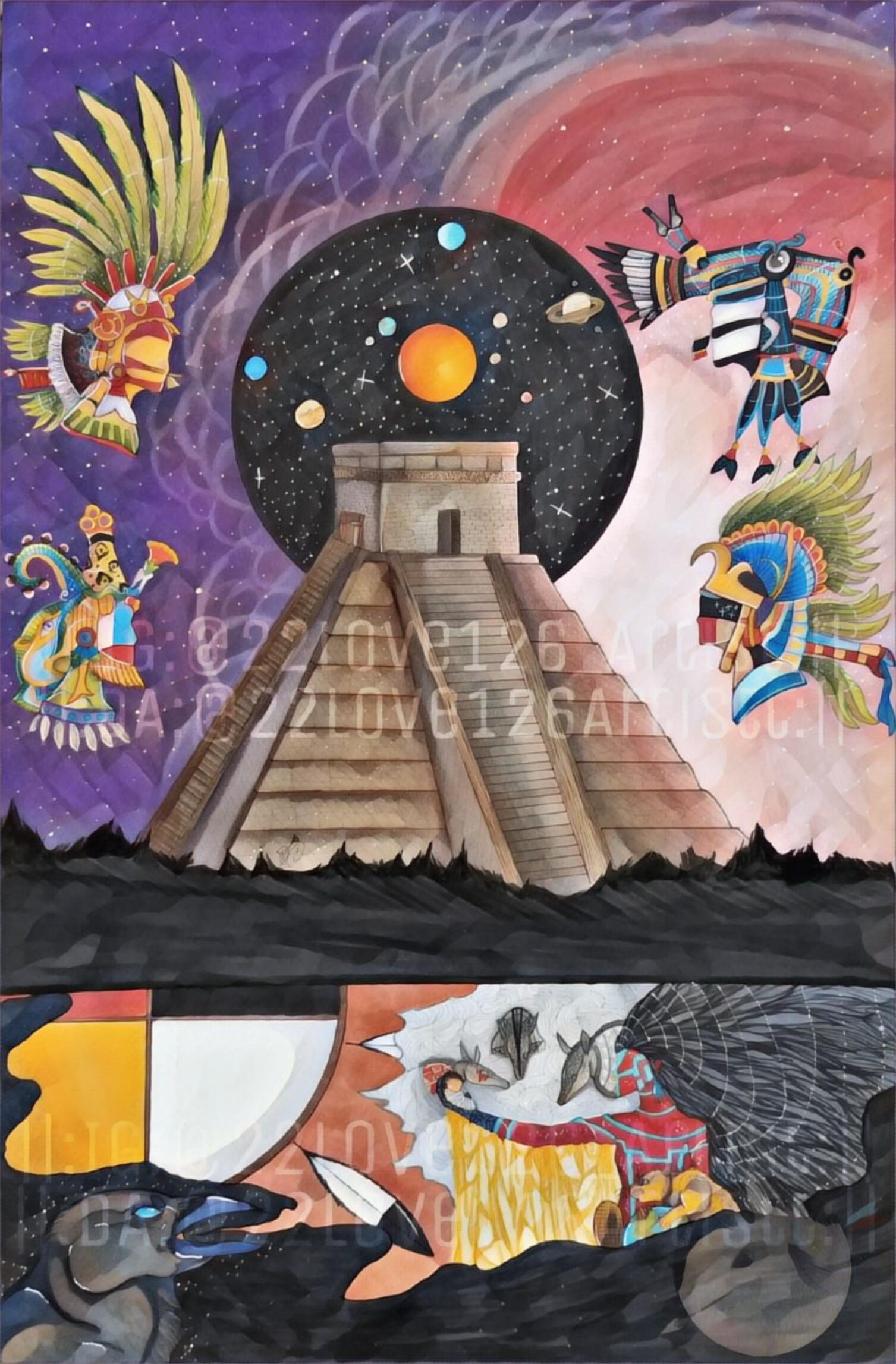 Toltec Nations unfortunately lost its description with its gallery due to deadlines and i didn't get the chance to save it. I can no longer find it either due to the gallery decided not to use the description due to it's length.The piece though, Was meant to shine a light on the mistreatment of Mexico and it's people. It was a subject at the time people were uncomfortable with stating migrants are NOT immigrants they are indigenous people who have migrated for thousands of years. It was my way of honoring them and they're incredible ancestral blood. I wanted to speak out about how their culture is just as used and profited off of as our tribes, Let alone labor.I did draw this in terms of mayan and toltec inspiration as at the time i was extra drawn to their beliefs and meanings while making my attempt to speak up for the people. I was younger and still quite shy, Stage fright especially so to this day i wish i had the ability to execute this piece and its meaning more but due to deadlines and being honored to gift this to a restaurant called Mezcalito; i'm very glad i illustrated this and spoke up at the time.