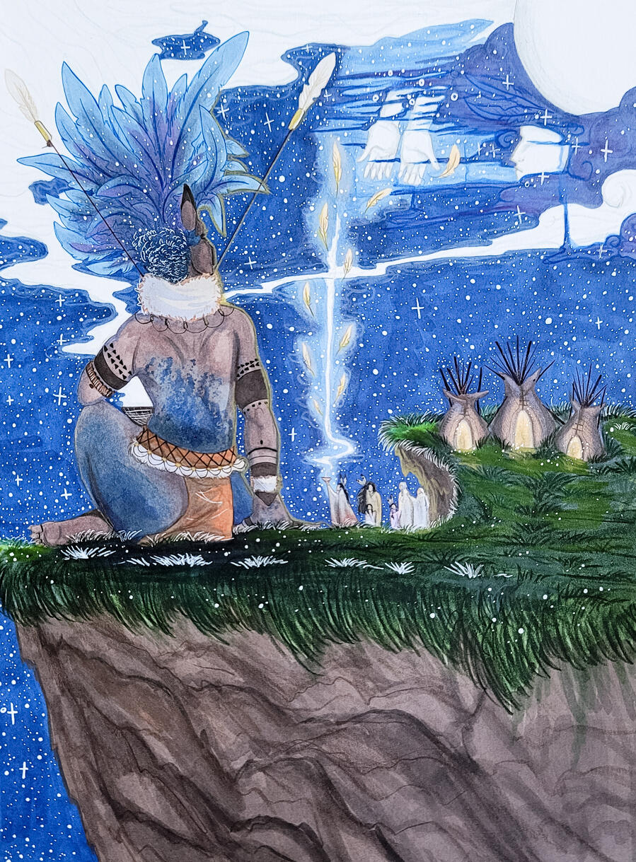 He mimics the birds and plant people to blend inside of the environment. once grandmother moon rises and lifts the tides herself, he fades into the stars until the next morning.